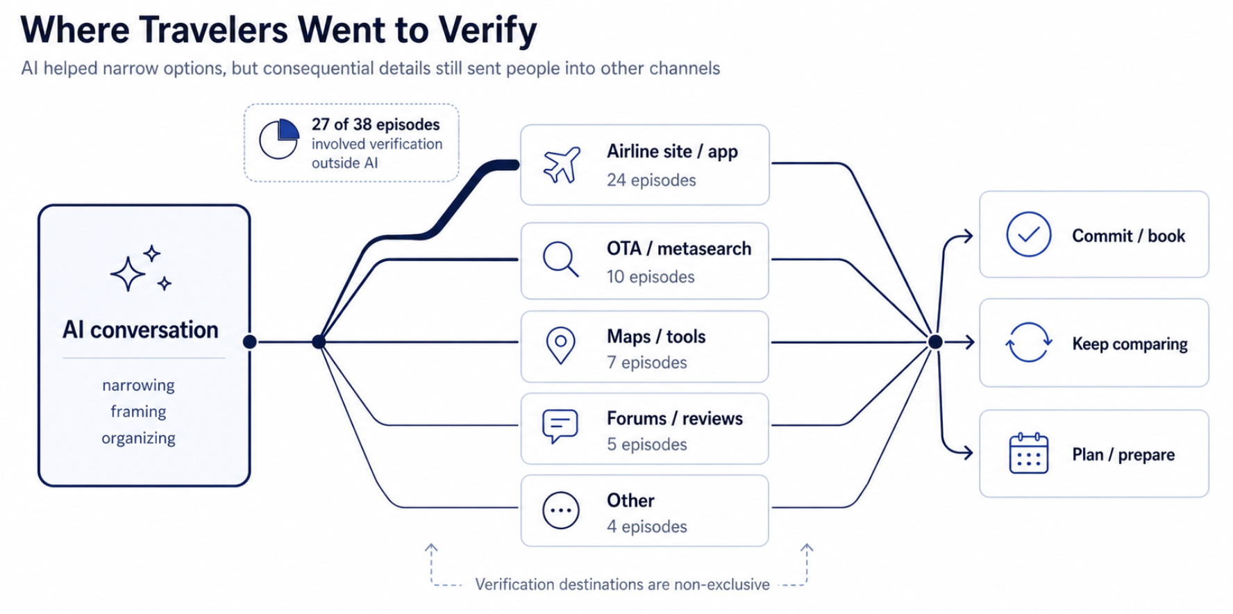 Participants did not generally treat AI as a booking endpoint. Instead, they treated it as a planning and reasoning layer that helped them narrow and interpret options before moving into more authoritative environments. In 27 of the 38 episodes, participants verified at least one consequential detail outside AI before acting. In 24 episodes, that verification specifically involved returning to an airline-owned channel for fare details, schedule confirmation, baggage rules, seat selection, policy clarity, or final booking confidence.