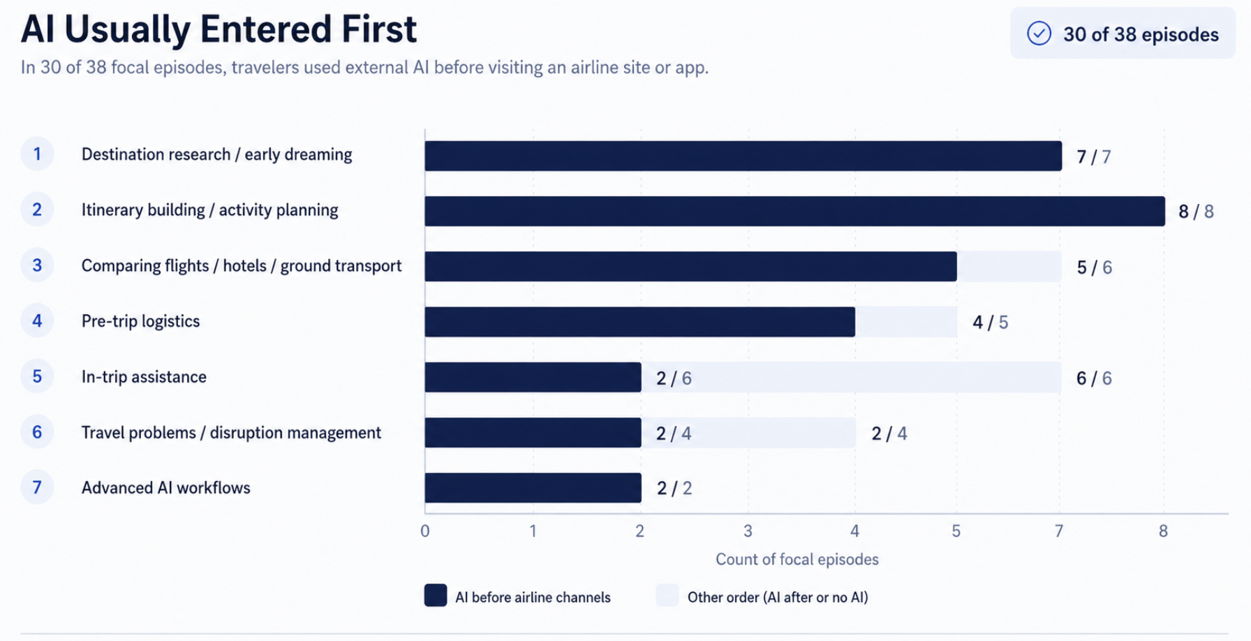 Only a small minority of participants used advanced workflows such as custom GPTs, saved travel assistants, or more elaborate prompt chains. The mainstream behavior was more straightforward: travelers wanted external AI to help them think, compare, and organize, and then wanted airline systems to validate, personalize, and complete the transaction. That made the strategic opportunity look less like “own the entire AI planning journey” and more like “remain authoritative when customers arrive with AI-shaped intent.”