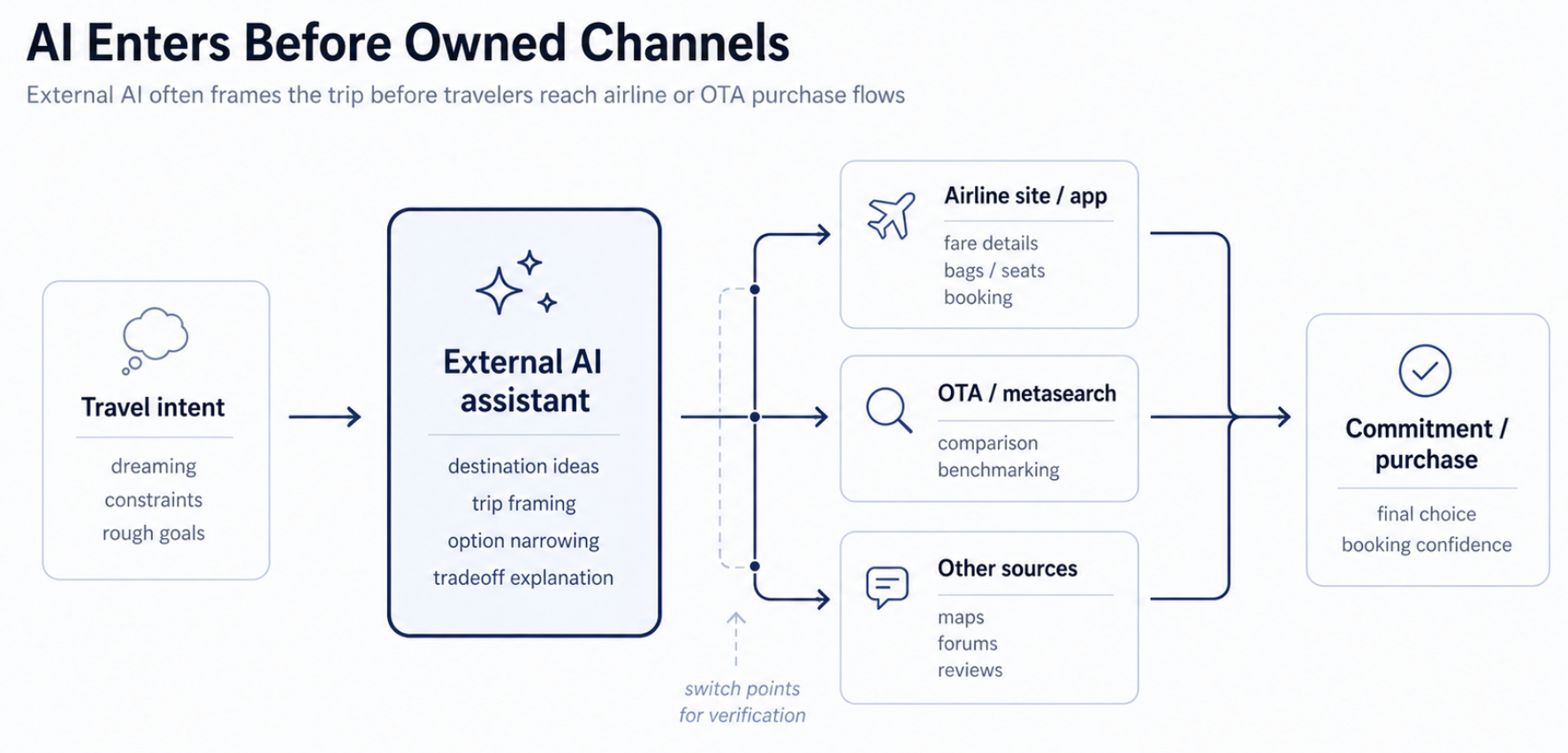 For airlines, this creates a new upstream problem. By the time travelers enter an airline’s app or site, they may already be carrying an AI-generated shortlist, a draft trip structure, and a set of expectations about how planning information should be explained. The challenge is no longer only whether an airline appears in the consideration set. It is whether that airline’s channels feel coherent once customers arrive with an AI-mediated understanding of the trip already in hand.