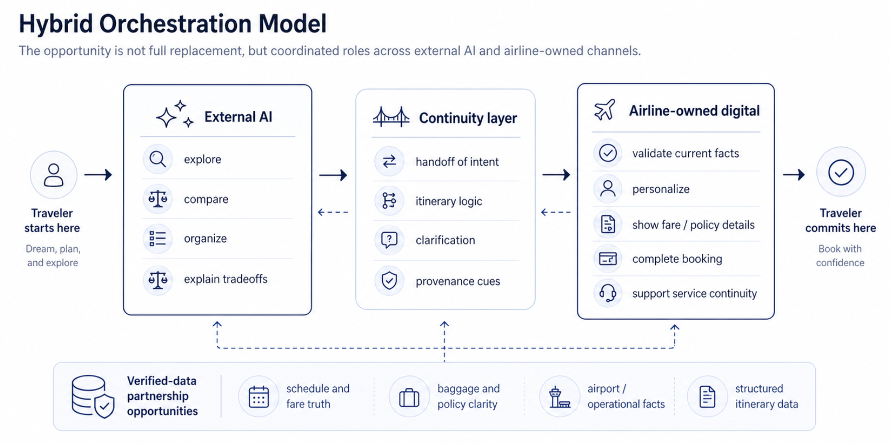 This points toward a hybrid model. An airline does not need to reproduce every external AI behavior inside its own channels. It does, however, need to selectively mirror the strengths of external AI in the moments where decision friction is highest. These include clearer itinerary logic, side-by-side tradeoff explanation, conversational clarification of fare and policy questions, and more intelligible presentation of dynamic travel facts. At the same time, the airline has reason to consider how verified data, itinerary structure, and policy information can be surfaced more accurately in the external AI environments where planning increasingly begins.