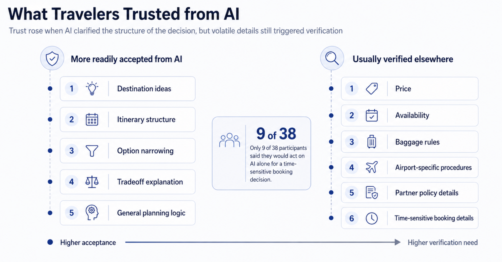 Trust dropped quickly, however, when the output touched volatile or policy-sensitive information without cues about source, recency, or uncertainty. Price, availability, baggage rules, airport-specific procedures, and partner-policy details were the most frequently rechecked items. Only 9 of the 38 participants said they would have acted on the AI output alone for a time-sensitive booking decision without verifying at least part of it elsewhere. Business-leaning and more frequent travelers were especially intolerant of ambiguity around these details.