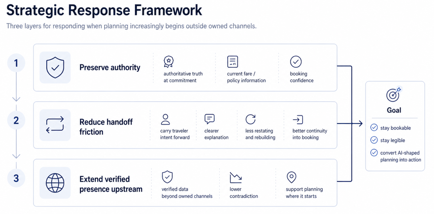 This work reframed the problem from one of AI visibility to one of AI-mediated continuity. The most important risk was not that travelers would never arrive in an airline’s channels. It was that they would arrive having already experienced a clearer, faster, more interpretable planning layer somewhere else. In that environment, the airline is no longer judged only on inventory and transaction capability, but on whether it can absorb AI-shaped intent without forcing the customer to start over.