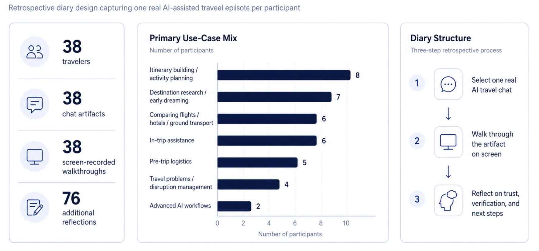 The final sample included 38 travelers across a range of travel contexts and planning moments. By primary focal episode, 7 participants centered on destination research or early dreaming, 8 on itinerary building or activity planning, 6 on comparing flights, hotels, or ground transport, 5 on pre-trip logistics, 6 on in-trip assistance, 4 on travel problems or disruption management, and 2 on advanced AI workflows such as custom GPTs or Gems. In total, the study generated 38 chat artifacts, 38 screen-recorded walkthroughs of real AI conversations, and 76 additional video and typed reflections on what participants trusted, what they verified elsewhere, and what they actually did next.