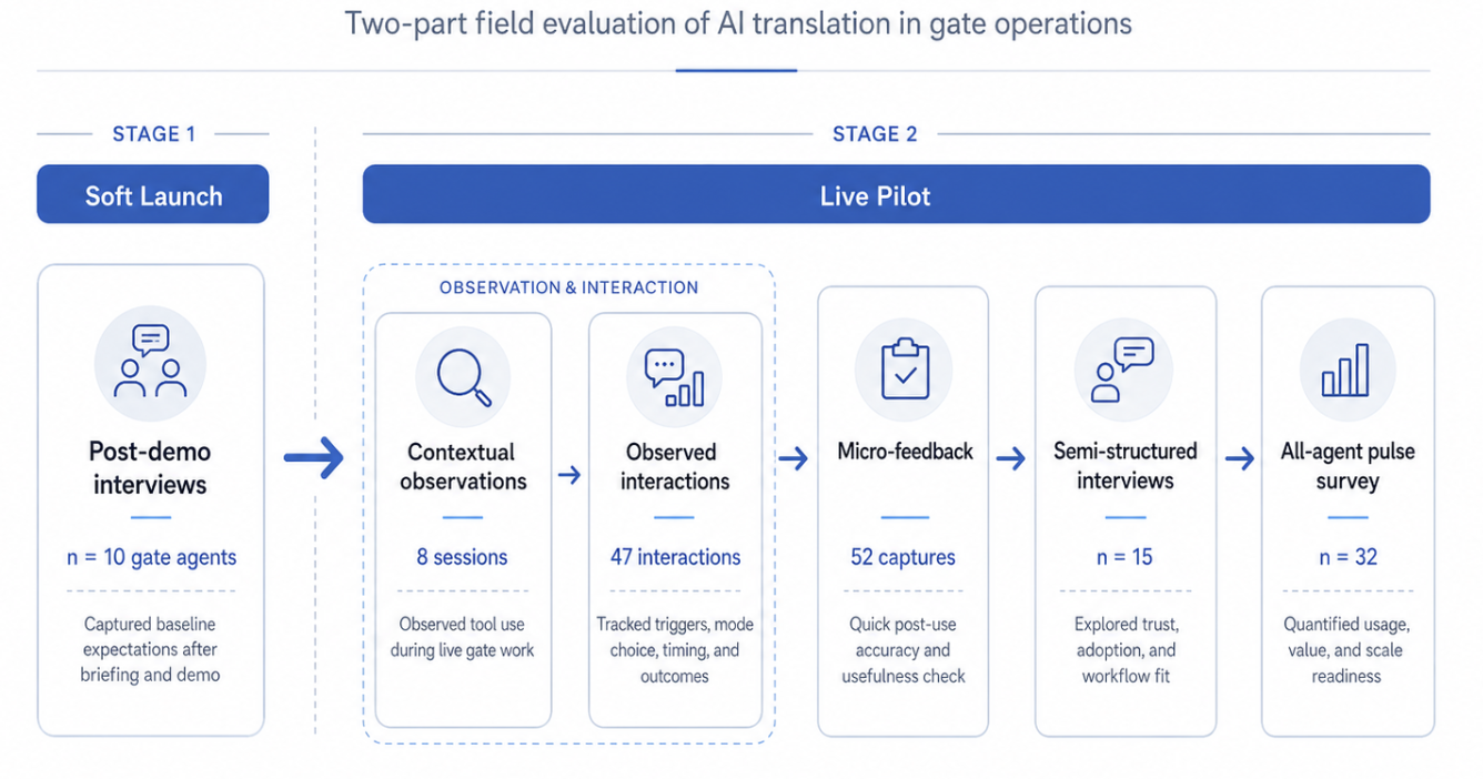 The research was conducted as a two-part field evaluation in an airport gate environment, beginning with a soft-launch briefing and demo discussion, followed by live gate evaluation during the pilot. The study focused on gate agents working international and domestic flights, with particular attention to high-diversity routes, peak boarding windows, documentation-related conversations, and moments where agents would otherwise rely on informal translation support.