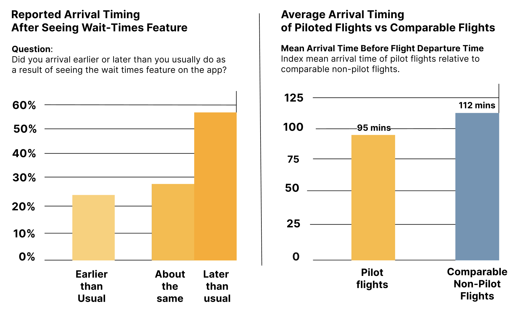 Survey results indicated clear awareness and behavioral impact. 71% of respondents noticed the feature, and among those, a majority reported using it to help decide when to go to the airport or approach security. Geofencing analysis provided early behavioral corroboration: during the 21-day pilot, arrival times for customers on pilot flights shifted later on average compared to travelers on comparable flights at the same terminal and departure windows where the feature was not available.