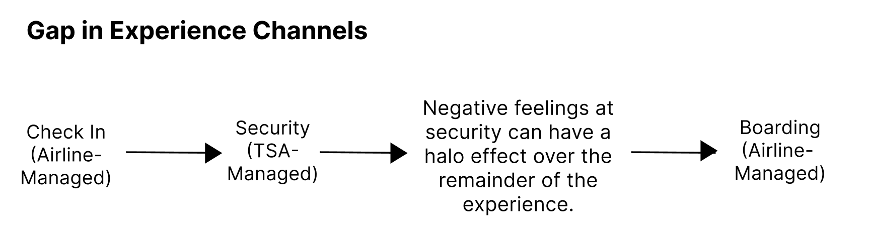 From the customer perspective, security poses a distinct challenge for airline experience design. Alongside delays, it is one of the strongest drivers of day-of-travel satisfaction, largely because it shapes when travelers decide to leave for the airport and how they experience arrival. Yet security screening is the one stage of the journey airlines do not control directly. It sits between parts of the experience the airline does influence, such as check-in, bag drop, and boarding. However, travelers do not separate these boundaries when evaluating their experience. Stress at security produces a halo effect that the airline ultimately absorbs.