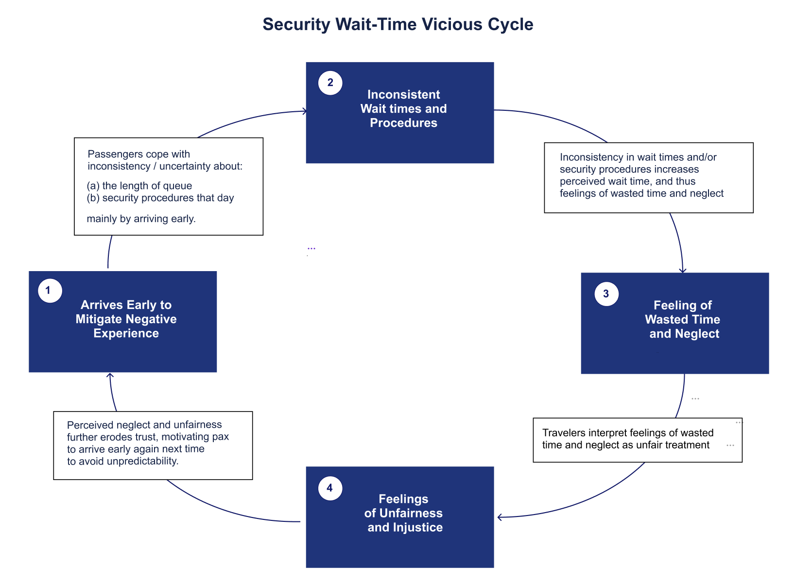 Foundational research examined how uncertainty around security shapes traveler emotions, planning behavior, and perceptions of fairness. This phase focused on how travelers decide when to leave for the airport, how they build buffers, and how security outcomes influence downstream satisfaction with the airline—despite security not being airline-controlled.