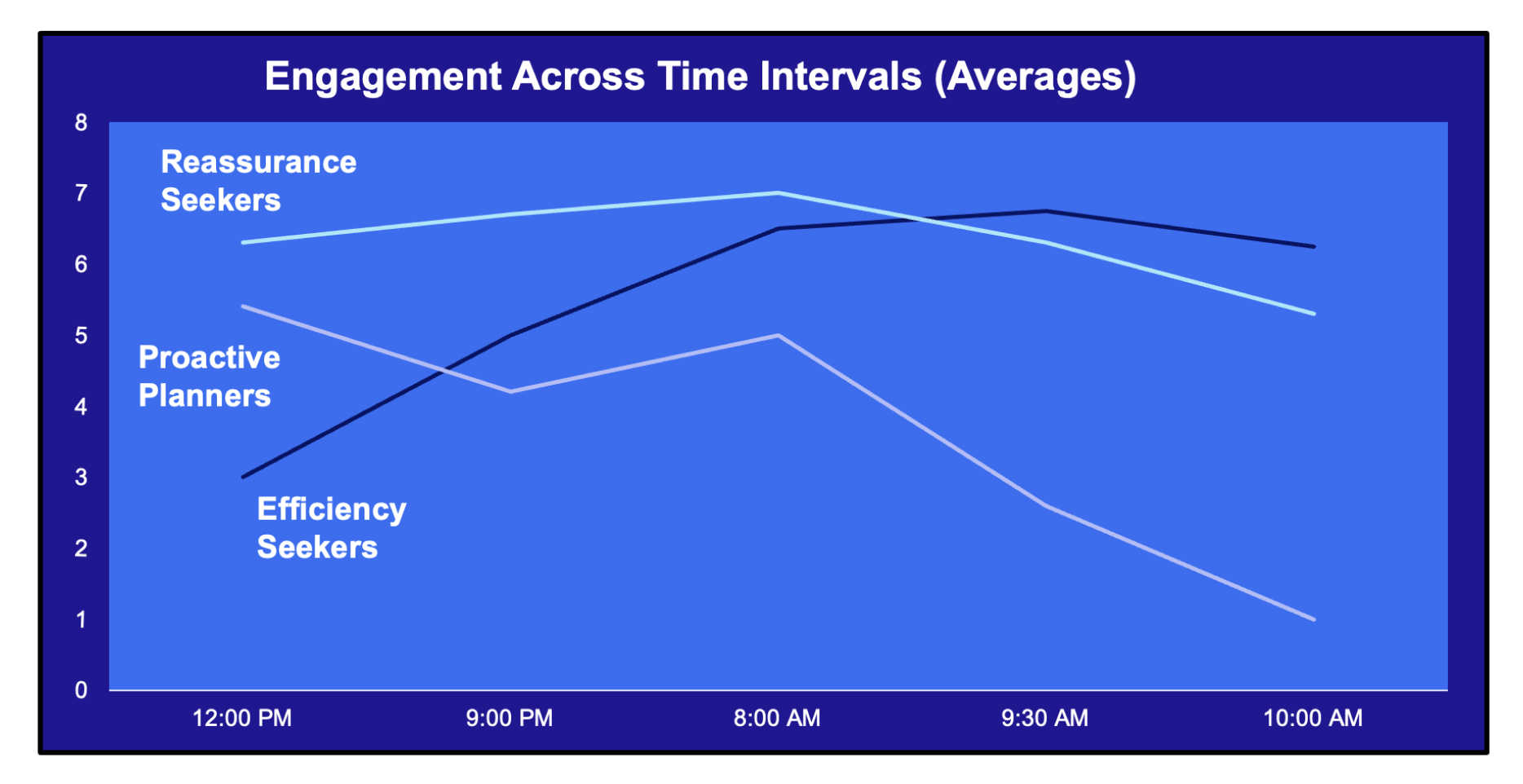 As shown in the visual above, these engagement patterns reflect how participants responded when asked when they would engage with a Security Wait-Time feature during the planning window. Participants indicated different modes of engagement depending on temporal proximity to departure. Earlier in the planning window, many described using the feature primarily for reassurance—checking wait times to reduce uncertainty without necessarily changing their intended arrival time. Closer to departure, responses shifted toward efficiency-oriented use, with wait-time information informing more immediate timing decisions. A third pattern—proactive planning—appeared more stable across intervals, with participants indicating consistent engagement but heightened sensitivity to framing and precision. These reported patterns clarified that the feature was not serving a single behavioral function, but multiple functions that varied by time-to-departure.
